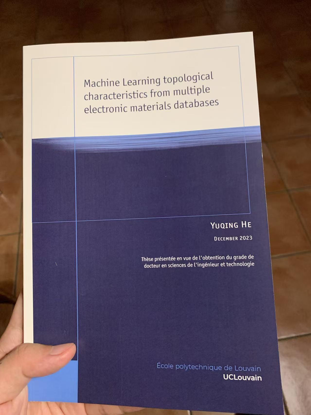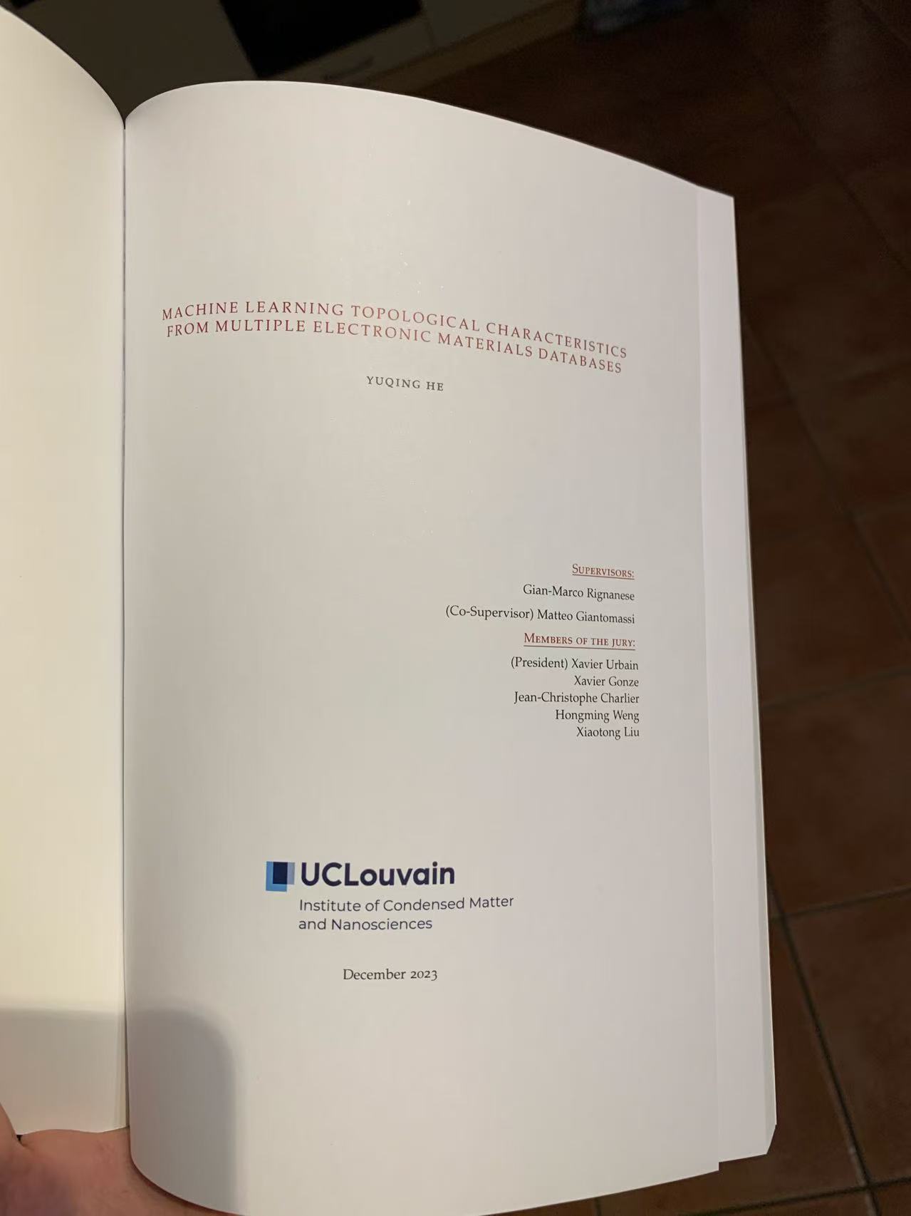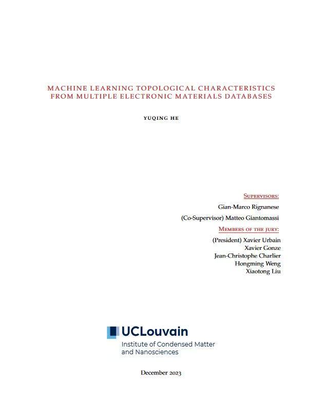 根据 UCLouvain 官方学术数据库 DIAL 记录,本次博士论文题目为 Machine Learning topological characteristics from multiple electronic materials databases,答辩日期为 07/12/2023,导师为 Gian-Marco Rignanese 与 Matteo Giantomassi。